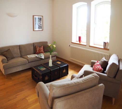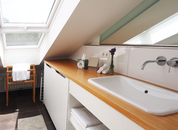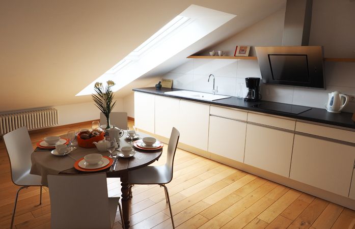 Großzügige Dachgeschosswohnung für 2 bis 6 Personen mit einem Schlafzimmer (Doppelbett), einem Kinderzimmer (2 Einzelbetten), einem Wohnzimmer, einem Fernsehzimmer (Schlafsofa), Küche und Bad.