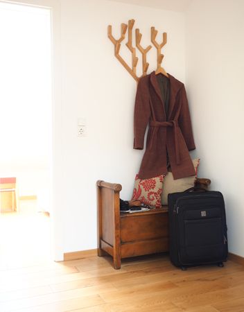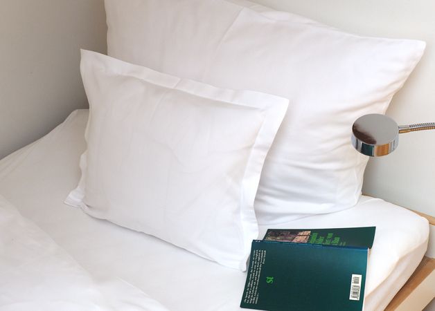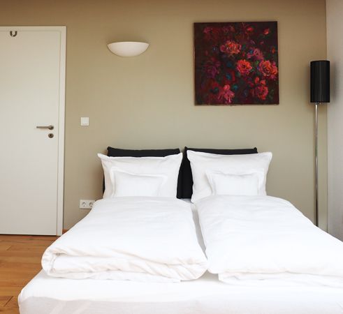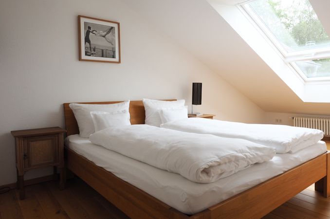 Metallfreies Vollholz-Doppelbett mit Schweizer Liegesystem Hüsler Nest und extra breiten und langen Federbetten. Hochwertige Bettwäsche und Hand- bzw. Badetücher.
