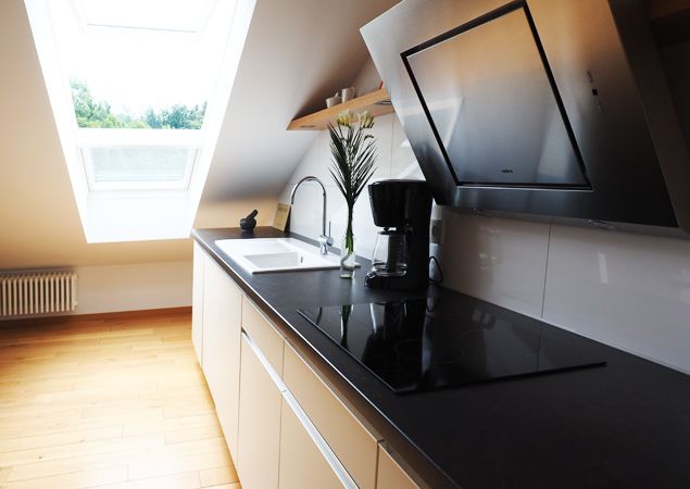 Voll ausgestattete Küche mit Herd, Kühlschrank, Geschirrspüler, Wasserkocher, Kaffeemaschine (Filter Nr. 4) und Espresso-Kocher. Großzügige Ausstattung an hochwertigem Villeroy & Boch-Porzellan und Gläsern sowie Pfannen, Kochtöpfen und sonstigen Küchenutensilien.